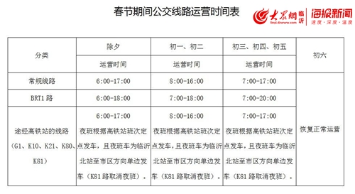 春节假期期间(1月24日-1月29日)途经高铁站的公交线路(G1、K10、K21、K80、K81路)白班首班、末班发车时间与其他公交线路一致(除夕:6:00-17:00,初一、初二:8:00-16:00,初三、初四、初五:7:00-17:00),班次适当缩减;夜班班次将根据高铁站的运营时刻表定点发车(K81路取消夜班车),且夜班车为临沂北站至市区方向单边发车。